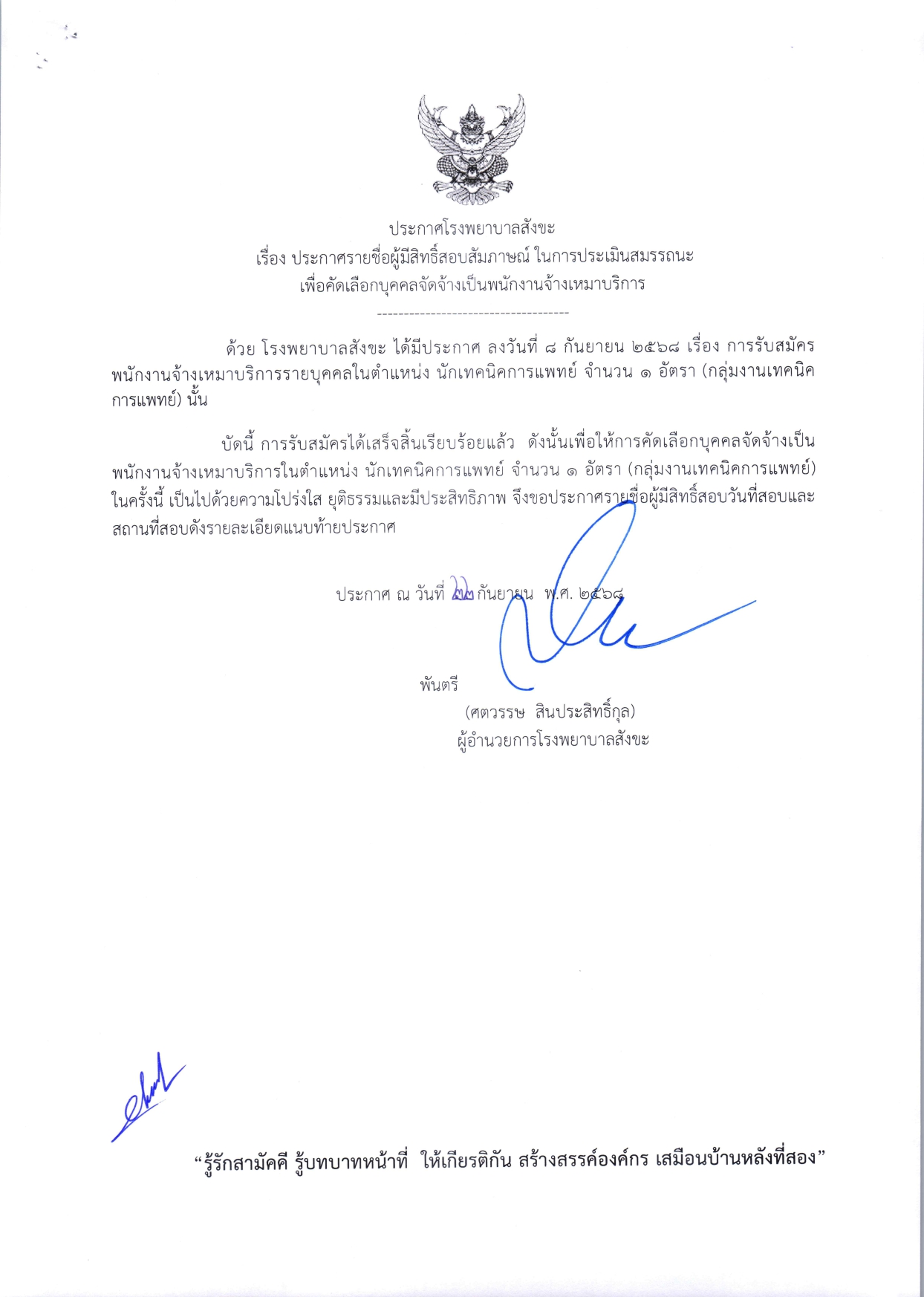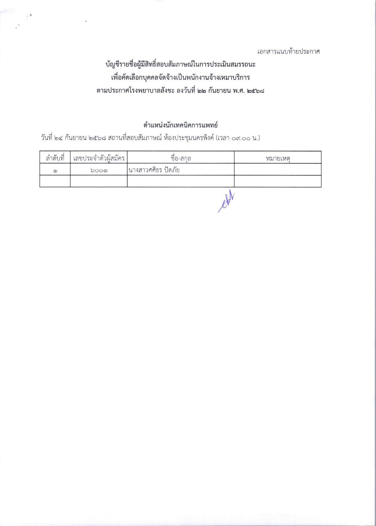 ประชาสัมพันธ์ ประกาศรายชื่อผู้มีสิทธิ์สอบสัมภาษณ์ ในการประเมินสมรรถนะ เพื่อคัดเลือกบุคคลจัดจ้างเป็นพนักงานจ้างเหมาบริการ ในตำแหน่ง นักเทคนิคการแพทย์