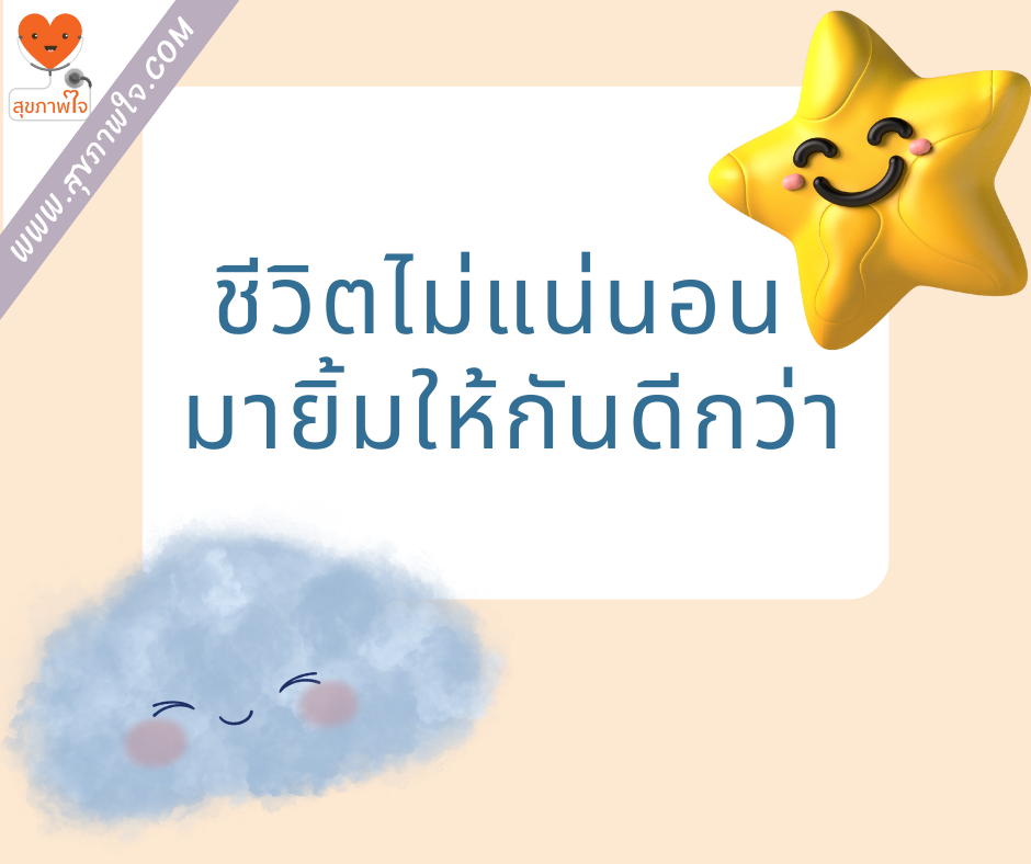 สาระสุขภาพใจ ชีวิตไม่แน่นอน…มายิ้มให้กันดีกว่า บนท้องฟ้า 🌥 ไม่มีอะไรแน่นอน ถ้ามองจากตรงนี้ เดี๋ยวก็มืด🌚 แล้วก็สว่าง🌕 อาจจะมีฝน ⛈ ก่อเป็นพายุ 🌪 หรือลม 💨 ลอยปลิวอยู่แค่นั้น สุขที่เคยเดินทางตามหามานาน ไม่ได้ไกลที่ไหน อยู่แค่นี้เอง เริ่มต้นวันใหม่ ด้วยการยิ้ม 😁 😁ให้กัน ทั้งวันเราจะมีความสุข